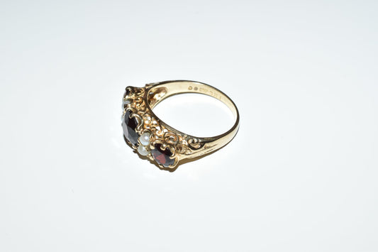 Vintage Jewellery - 9ct Gold Garnet & White Seed Pearl Ladies Dress Ring