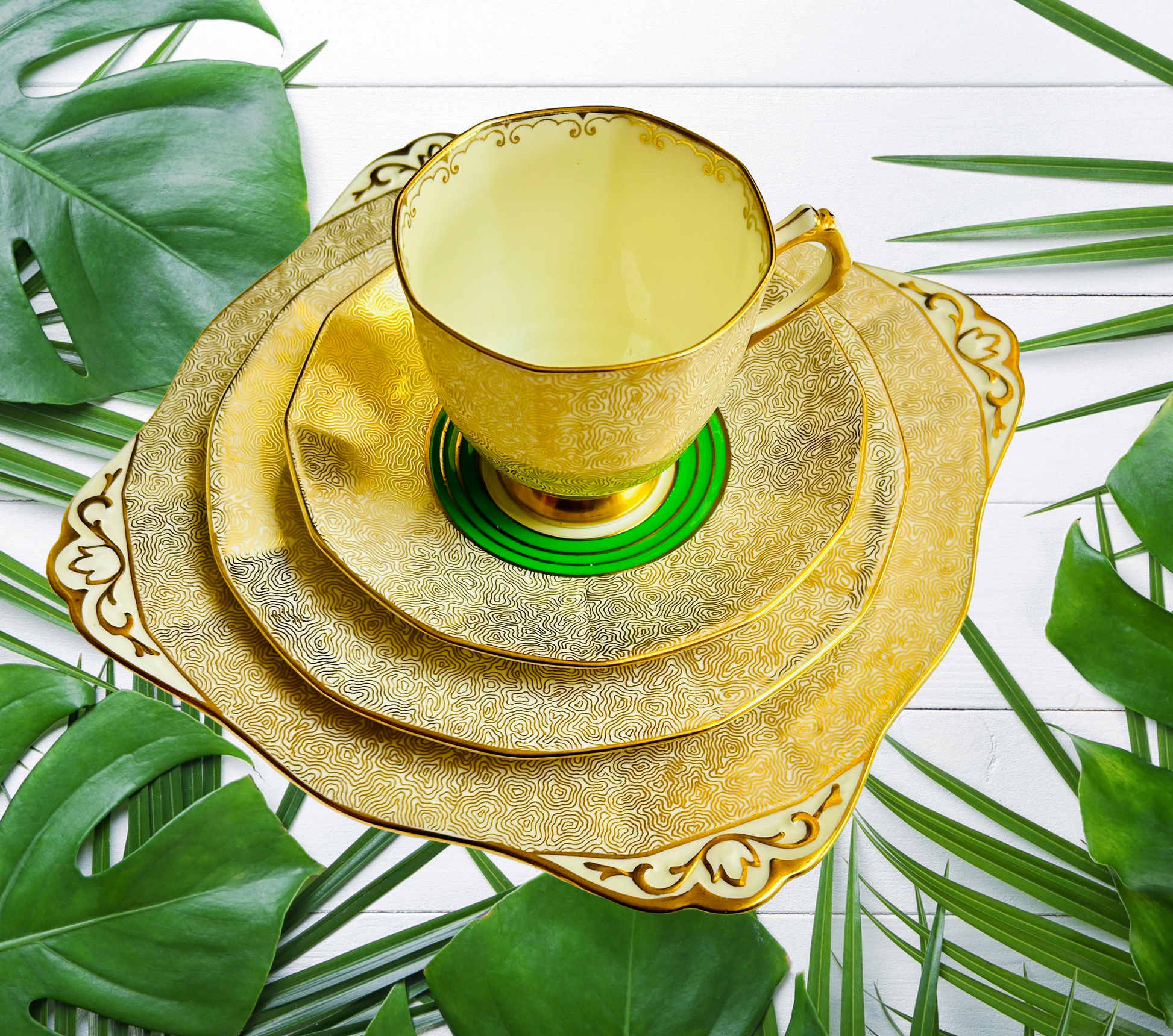 Service à thé Art déco vintage, tasses et soucoupes. Fabriqué en Angleterre par Tuscan China. Une pièce rare. Filigrane doré et bande verte audacieuse. Fabriqué vers 1930. Service à thé anglais élégant de collection. Vaisselle vintage de collection. Décoration d'intérieur raffinée.