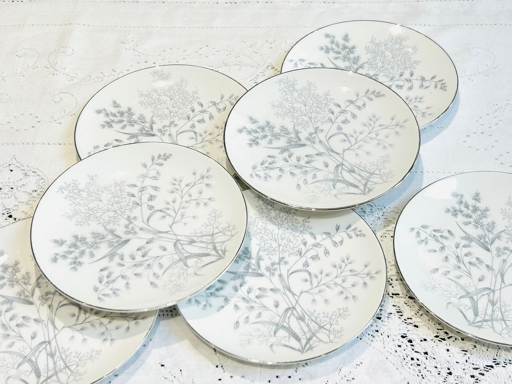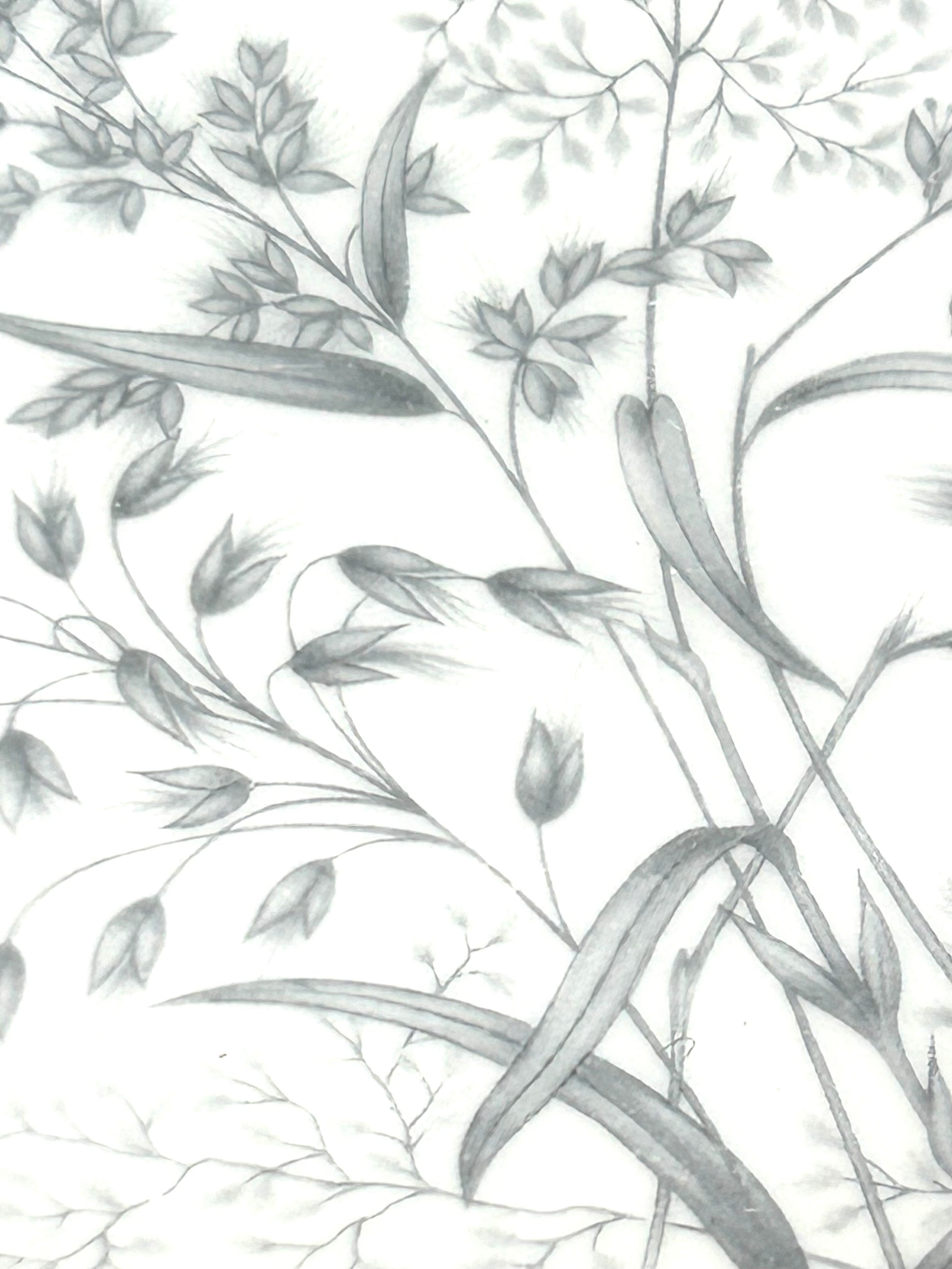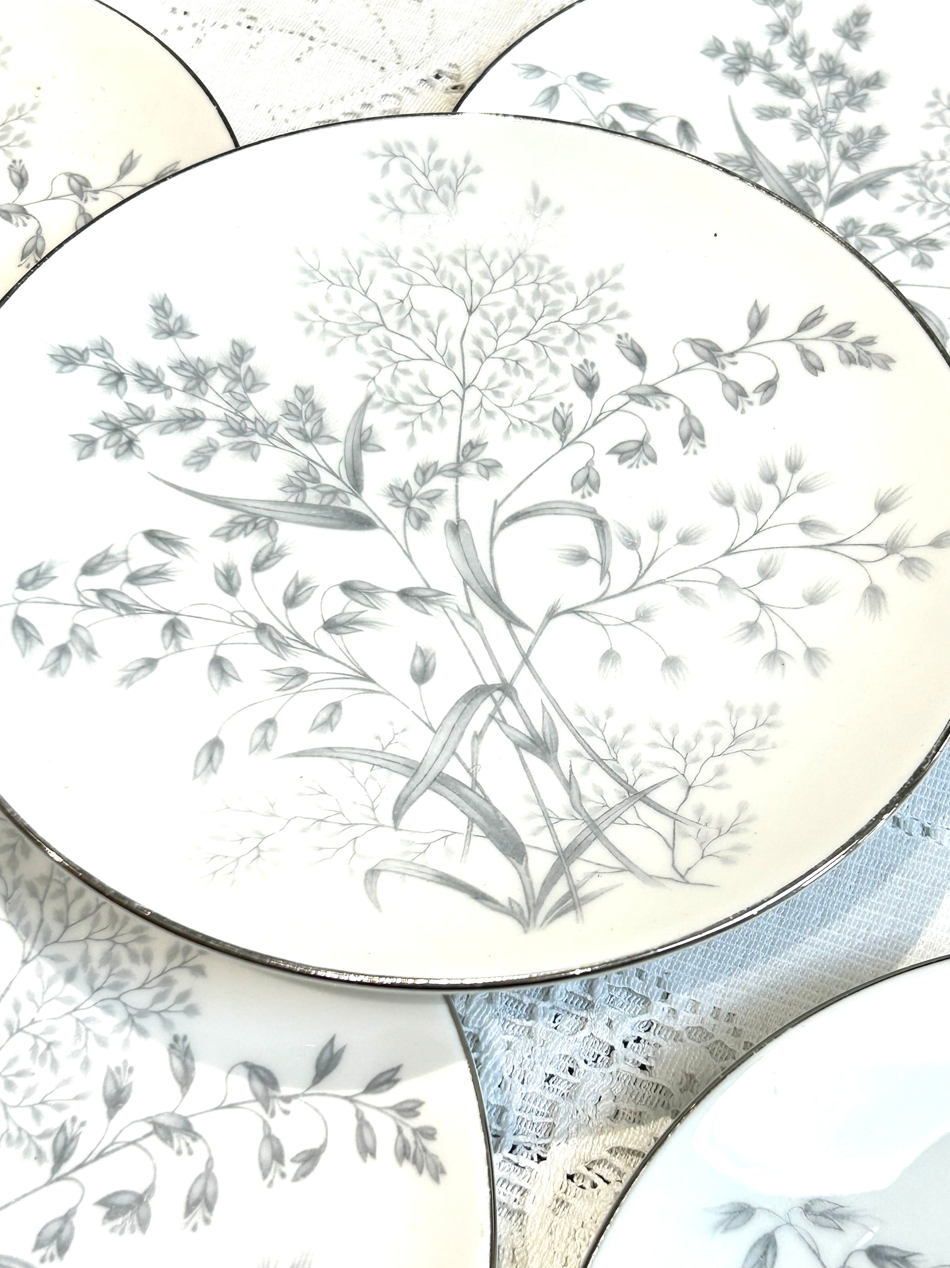 Service de table en porcelaine fine toscane, modèle « Woodside ». Base blanche décorée de feuillage gris argenté clair. Bordure platine.