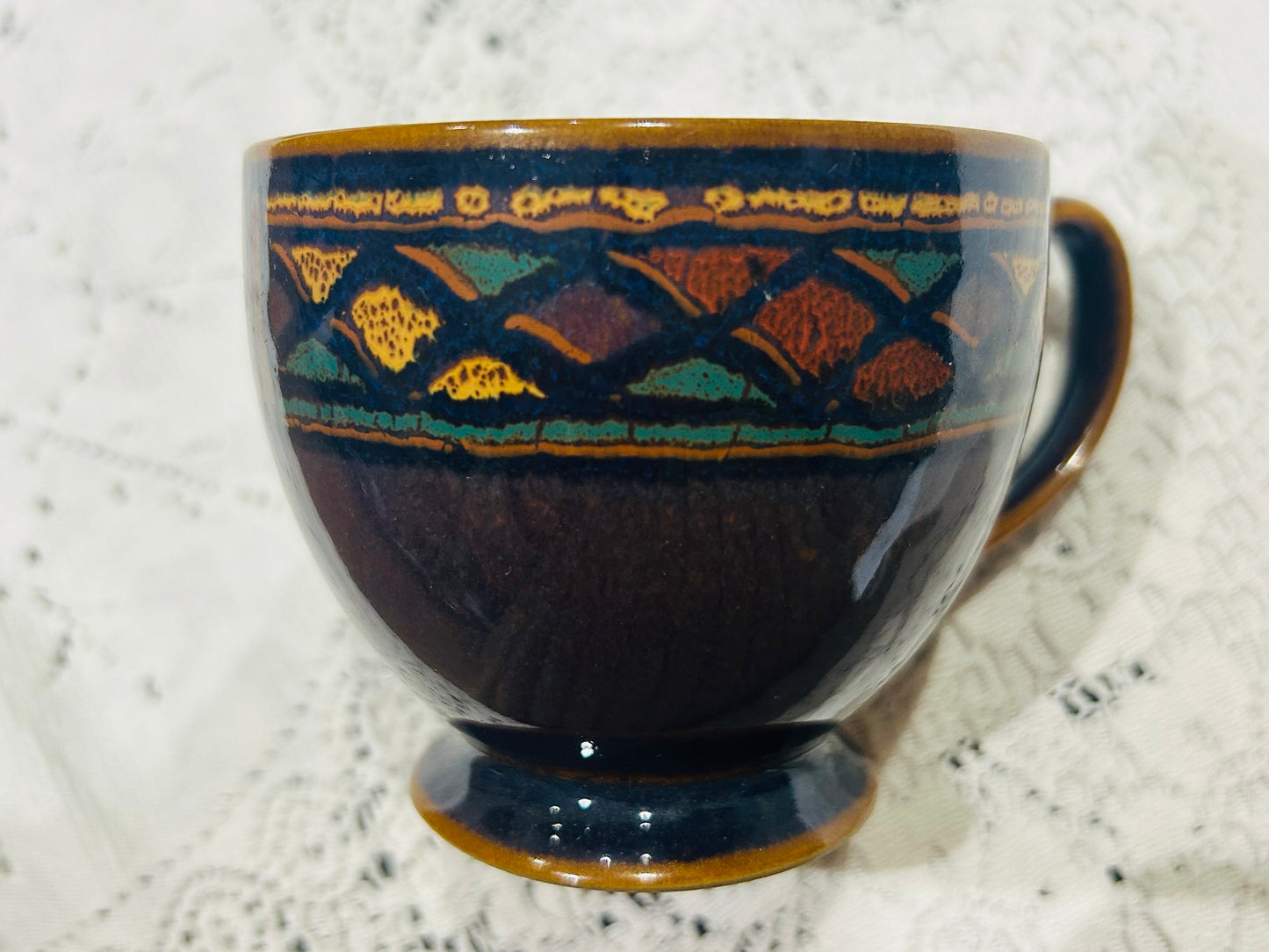 This iconic 1990s design features a rich, dark brown glaze accented by a bold geometric band in earthy tones of terracotta, teal, ochre, and navy — inspired by Moroccan motifs.
