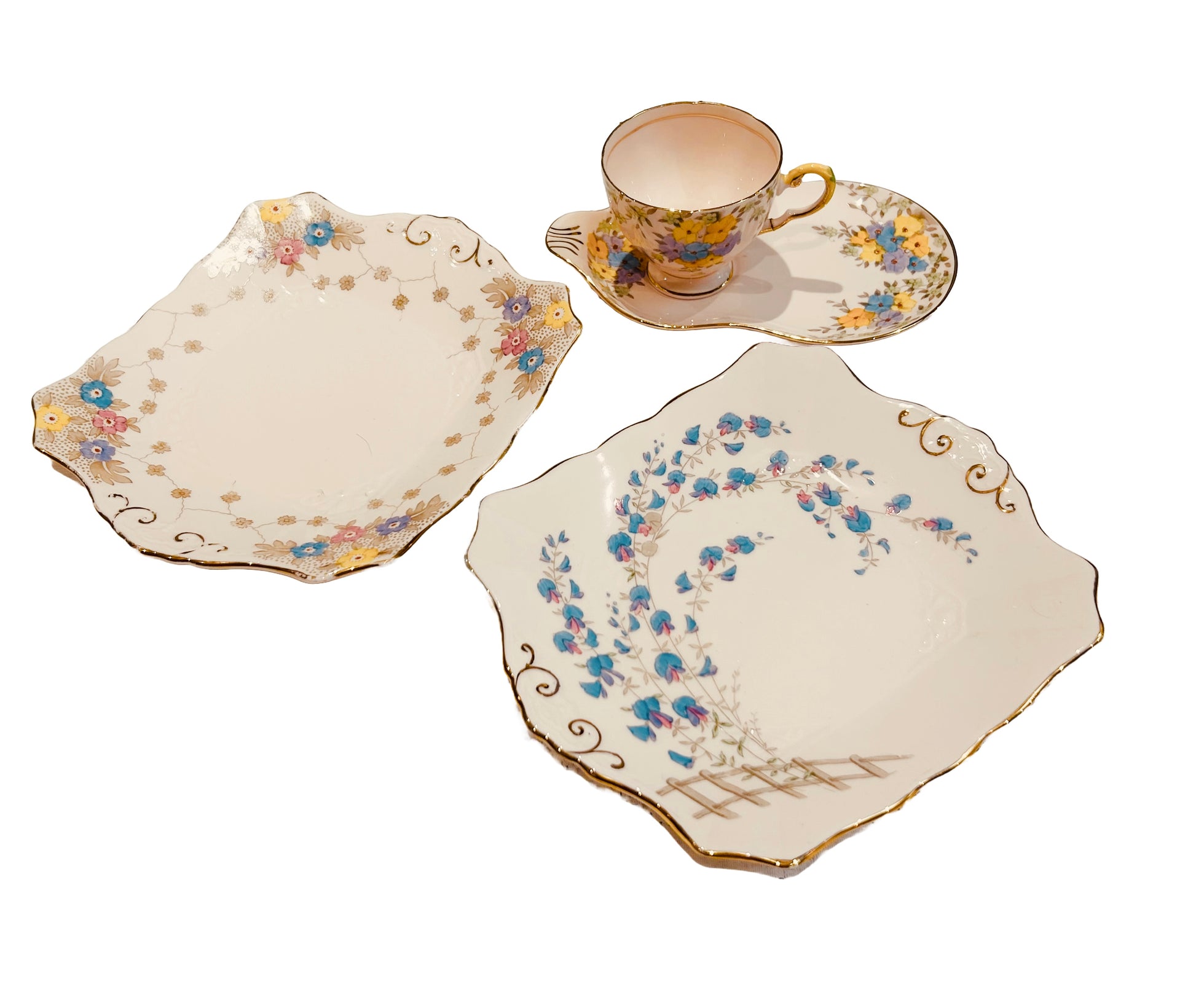 A mixed selection of shabby chic plates by Tuscan China. Pretty afternoon tea plates. The cup set is display only as there is unfortunately a crack in the teacup handle. Made in England mid century. English fine bone china.