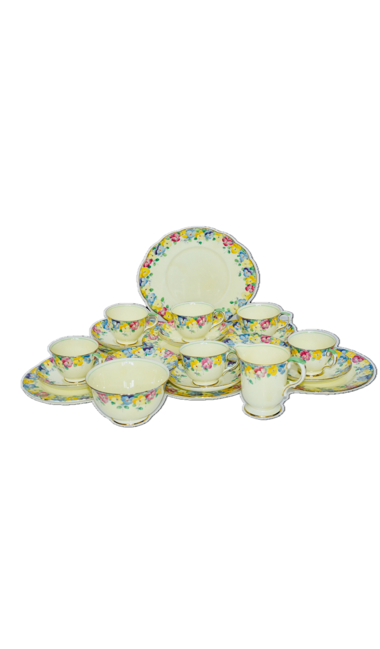 This eye catching floral Tea Set by Crown Staffordshire China, England is true vintage elegance. Featuring a delightful buttermilk background, each piece is adorned with charming blue, pink, and yellow flowers. The set's timeless design and vibrant floral patterns make it a perfect addition to any collection, capturing the essence of a bygone era with its delicate beauty and craftsmanship.