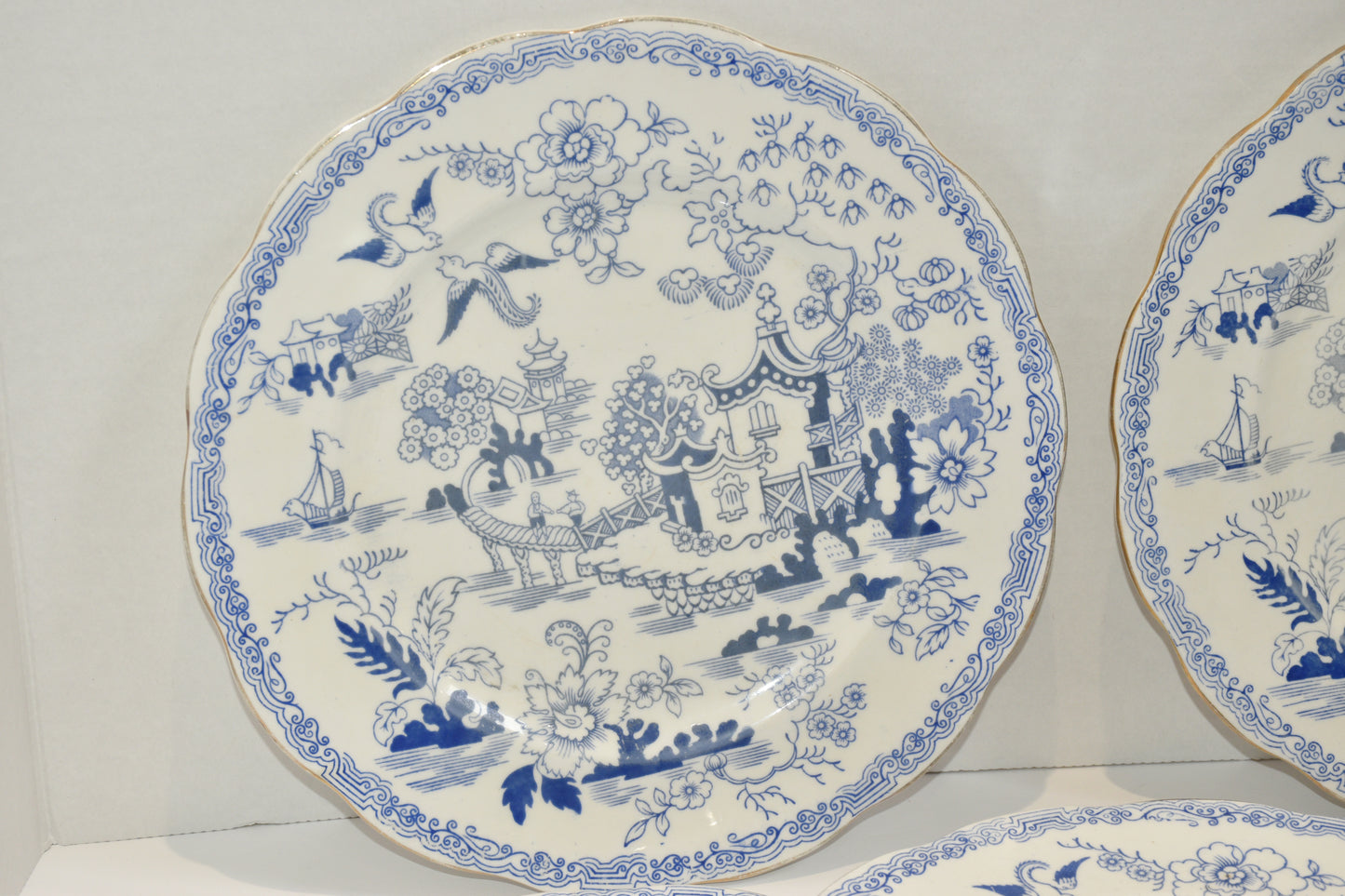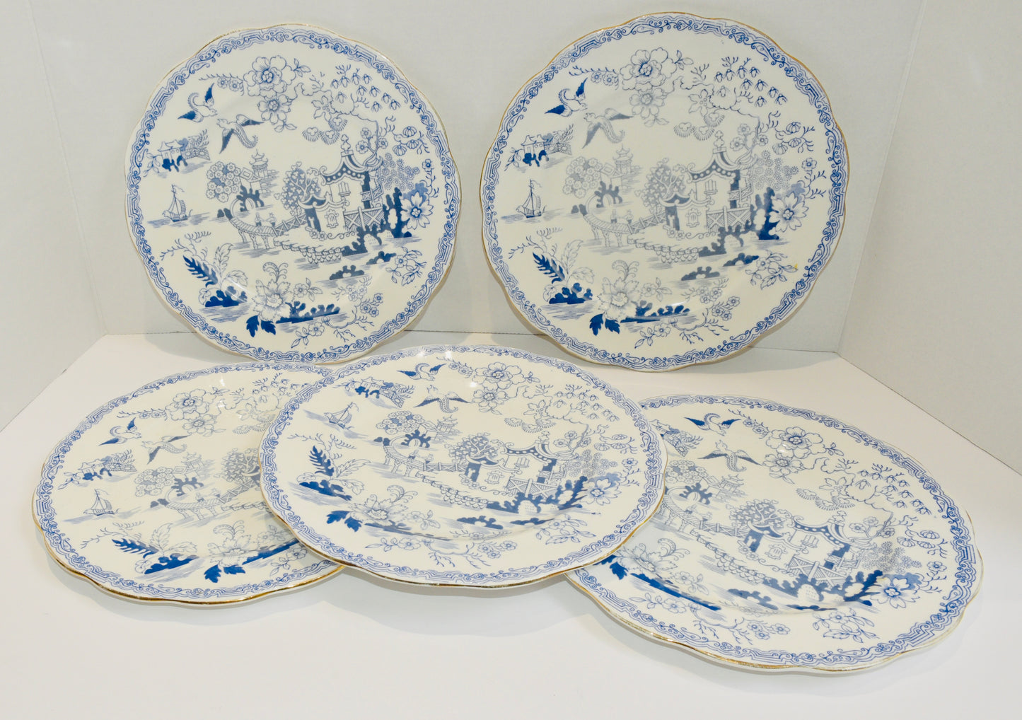 A set of 5 vintage dinner plates made in England by Royal Albert in the Mikado pattern. Diameter 10". Vintage, pre owned items. Overall good condition, some colour fading and gilding rub.