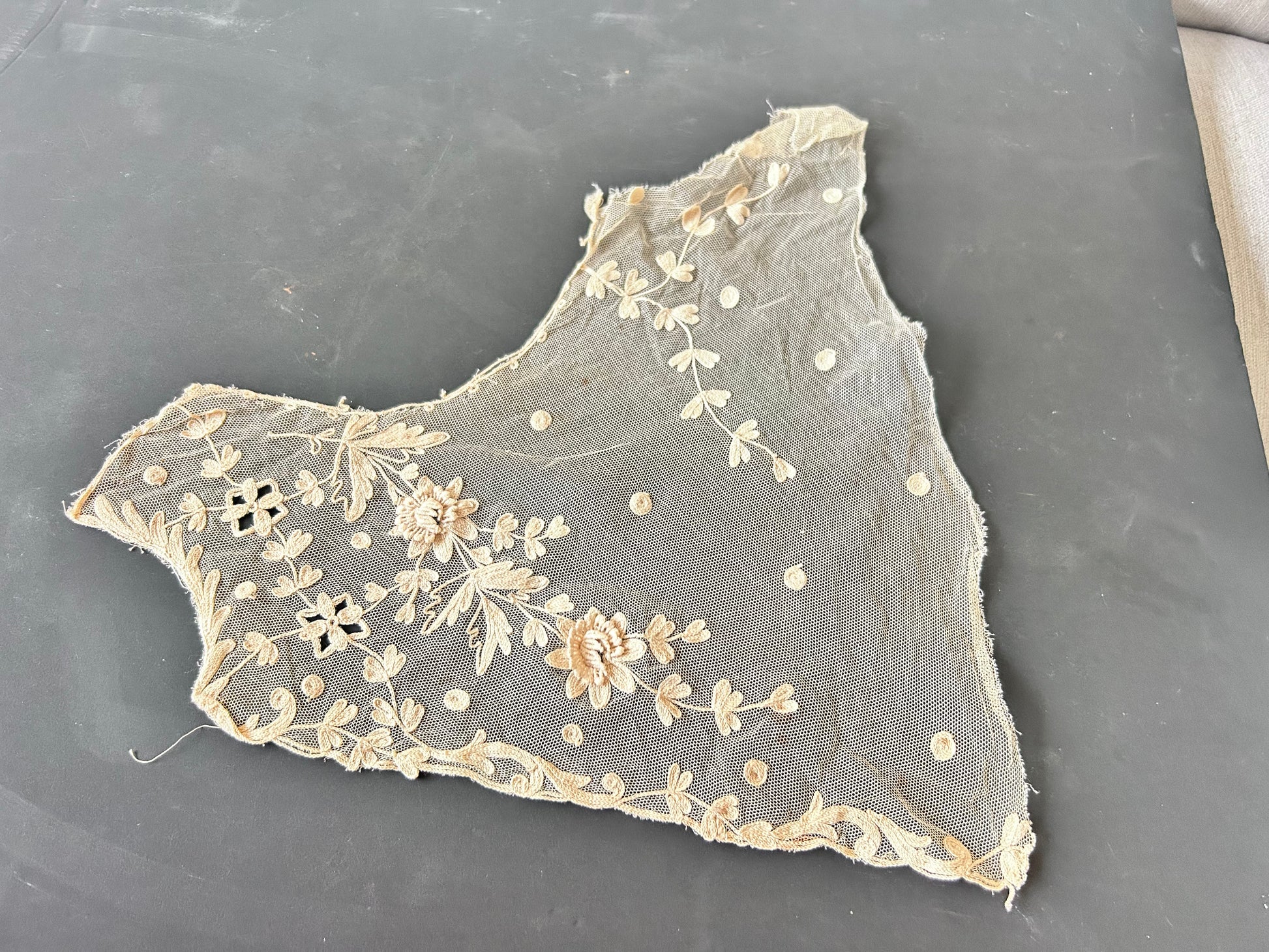 Vintage Floral Embroidered Lace Panel – Scalloped Mesh, Beige Threadwork, Textile Art