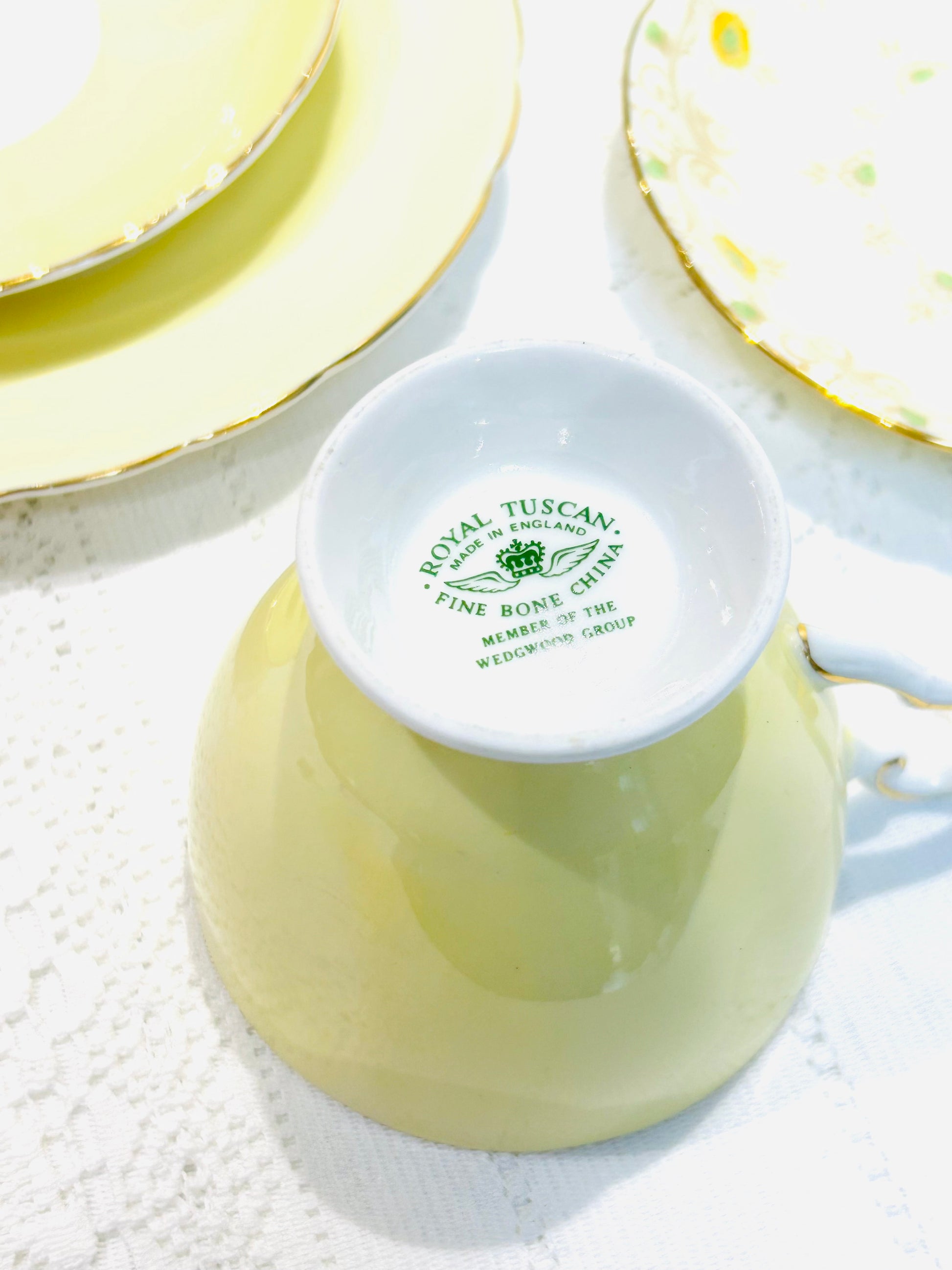 A charming mismatched vintage yellow tea set, ideal for afternoon tea or display. This delightful mix features fine bone china pieces from Tuscan and Royal Grafton, each with its own unique character and classic English style. 19 Piece Set in a bright summer yellow and contrast green with gold accents.
